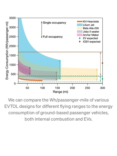First, at single occupancy, EVs are comparable to traditional Internal Combustion Engine cars at full occupancy so carpooling is still very important if your goal is to minimize carbon footprint. Next, comparing single occupancy across eVTOL and EV it's easier to compare directly with specific models of eVTOL at 50 mile range, for example. EVs average around around 400 Wh / passenger mile.